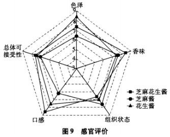 由圖9能夠看得出,白芝麻番茄醬除在機構(gòu)情況方 面小于純芝麻醬外,其他層面均好于純芝麻醬,而且在香氣、口味、整體具體性3層面最好。白芝麻番茄醬色調(diào)比較暗紅色,在機構(gòu)情況層面,可能是因為黃豆 蛋白質(zhì)的添加,醬體相對性粘稠,機構(gòu)情況下降;與此同時因 純芝麻醬鹽酸成分較高,單糖和低聚木糖成分較少,苦澀味重、清甜味低、口味差,糖槳和番茄醬的添加能夠大大提高麻醬在那些領(lǐng)域的不夠,使醬體香甜醇正,口味最好。