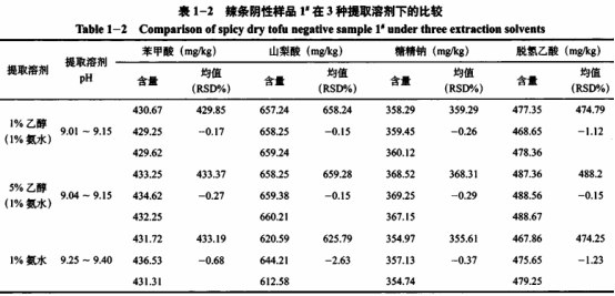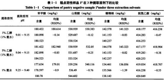按以上制取供試品水溶液,上機操作測量,外標(biāo)法定量分析測算各成分成分,結(jié)果見表1,從表格中得知,針對歸類為點心的試品,不論是點心、月餅或是辣皮,當(dāng)獲取有機溶劑呈偏偏堿時,獲取率高些,尤其是植物油脂成分高的試品,偏偏堿的條件更強的維護這4種總體目標(biāo)物的損害,故獲取有機溶劑在5%酒精(1%氫氧化鈉)時,試品所得的4成分成分全是最大的,綜合性考慮到,獲取有機溶劑挑選為5%酒精(1%氫氧化鈉)。