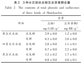 3種水豆豉的總酚及總大豆異黃酮成分見表2。未發(fā)醇水豆豉的總酚成分約為3mgGAE/g,經(jīng)解木薯淀粉枯草芽孢菌CAUnDJ118發(fā)醇后3種水豆豉的總酚成分比未發(fā)醇時(shí)提升了2倍,發(fā)醇大黑豆水豆豉的總酚成分最大,為6.8mgGAE/g,次之為發(fā)醇雙青豌豆水豆豉(6.7mgGAE/g),發(fā)醇大豆水豆豉的總酚成分最少(6.3mgGAE/g)。未發(fā)醇大豆、雙青豌豆水豆豉的總大豆異黃酮成分各自為1.2,1.1mgRE/g,發(fā)醇后大豆、雙青豌豆水豆豉的總大豆異黃酮成分比未發(fā)醇時(shí)多,各自提高到2.0,2.2mgRE/g。而大黑豆水豆豉的總大豆異黃酮成分在進(jìn)行發(fā)酵后轉(zhuǎn)變 較大 ,未發(fā)醇時(shí)大黑豆水豆豉的總大豆異黃酮成分為1.7mgRE/g,發(fā)醇后總大豆異黃酮成分提高了2.4倍,為4.0mgRE/g,高過(guò)發(fā)醇大豆、雙青豌豆水豆豉。