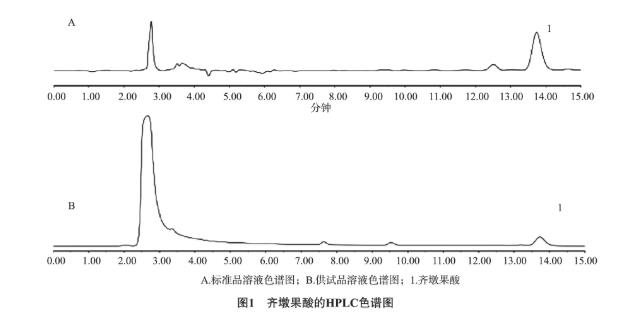 取新項目“2.1”和“2.2”項所制取的標(biāo)準(zhǔn)品水溶液和供試品水溶液,在“2.3”的色譜儀標(biāo)準(zhǔn)下氣相,齊墩果酸的保存期約為13.77min,峰型平穩(wěn),分離度優(yōu)良,有不錯的基準(zhǔn)線分離出來,末見殘渣峰影響,具備優(yōu)良的專屬性。如圖所示1所顯示。