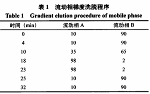 Agilent5HC-C18(2)(4.6×250mm,5μm)離子交換柱,進(jìn)樣量20μL,流動(dòng)速度1.0mL/min,柱溫35℃,以工業(yè)甲醇做為流動(dòng)性相A,以0.02moI/L乙酸銨水溶液為流動(dòng)性相B,梯度方向過(guò)柱,過(guò)柱標(biāo)準(zhǔn)見(jiàn)表1。應(yīng)用二極管列陣探測(cè)器,光譜儀范疇190~700nm;光譜儀步進(jìn)電機(jī)數(shù)值2.0nm,光譜儀收集方式。以保存期及光譜圖判定,在230nm和625nm光波長(zhǎng)下開(kāi)展檢驗(yàn),峰總面積外標(biāo)法定量分析。