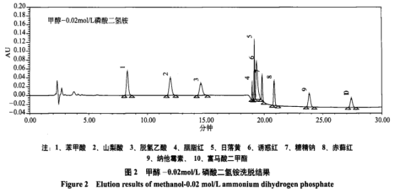 本實(shí)驗(yàn)較為乙腈-0.02mol/L乙酸銨和工業(yè)甲醇-0.02mol/L乙酸銨按表1梯度方向開(kāi)展過(guò)柱時(shí),發(fā)覺(jué)新紅與苯甲醛,靛青與脫氫乙酸分離度達(dá)不上1.5的規(guī)定,緣故將會(huì)有幾個(gè)方面:最先,乙腈過(guò)柱工作能力比工業(yè)甲醇強(qiáng),在UV光波長(zhǎng)較短的色譜上具備較高靈敏,且色譜儀級(jí)的乙腈是吸收力較為小的有機(jī)溶液,故乙腈過(guò)強(qiáng)的過(guò)柱工作能力及其乙腈獨(dú)有的特性都是會(huì)導(dǎo)致出峰時(shí)間靠前的目的物和殘?jiān)寤蚴青徑姆咫x不開(kāi);次之,苯甲醛、山梨酸、脫氫乙酸、納他霉素旋光性相較檸檬黃、日落黃、誘惑紅旋光性稍強(qiáng),選用乙腈階梯性梯度方向過(guò)柱,出峰速度更快,控制不了栽培基質(zhì)基準(zhǔn)線影響;其次,點(diǎn)心中的栽培基質(zhì)大部分為碳酸鹽、蛋白、糖原等,乙腈過(guò)柱不可以合理規(guī)避這種栽培基質(zhì)對(duì)目的物的影響,實(shí)驗(yàn)中也根據(jù)調(diào)節(jié)梯度方向過(guò)柱的占比,可是不管怎樣調(diào)節(jié)依然不能將13種總體目標(biāo)物徹底分離出來(lái),殊不知選用工業(yè)甲醇過(guò)柱可以有效的防止乙腈存有的這種難題,結(jié)果見(jiàn)圖1。此次實(shí)驗(yàn)還挑選了工業(yè)甲醇一0.02mol/L乙酸銨與工業(yè)甲醇-0.02mol/L磷酸二氫銨水溶液開(kāi)展梯度方向過(guò)柱,13種食用添加劑均為旋光性化學(xué)物質(zhì),與水均能相溶,選用0.02mol/L磷酸二氫銨對(duì)添加劑的分開(kāi)沒(méi)有危害,可是這一水體的流動(dòng)性相對(duì)性色譜儀分離出來(lái)危害很大,絕大多數(shù)色譜儀均不可以合理過(guò)柱,結(jié)果見(jiàn)圖2,綜合性考慮到,本實(shí)驗(yàn)最后挑選工業(yè)甲醇一0.02mol/L乙酸銨按表1程序流程開(kāi)展分離出來(lái)。