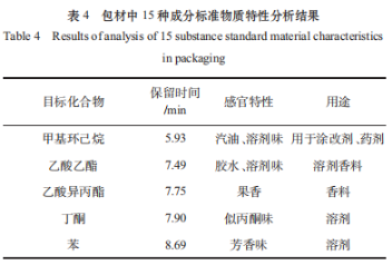 為更精確挑選明確檢驗(yàn)出飲中出現(xiàn)異常味道與15種包裝材料成份的對(duì)應(yīng)關(guān)系,最先選用GC剖析明確這種成分標(biāo)準(zhǔn)品化學(xué)物質(zhì)出峰時(shí)間及次序,次之對(duì)感觀特點(diǎn)科學(xué)研究,輔助驗(yàn)證科學(xué)研究健康飲品中出現(xiàn)異常成份的關(guān)聯(lián)性。