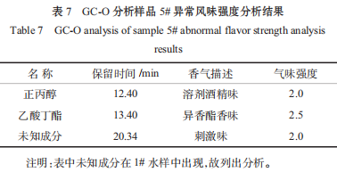 GC-O吸聞技術(shù)性科學(xué)研究與剖析具備象征性的3#、5#、7#試品及與1#水質(zhì)采樣標(biāo)準(zhǔn)品開展核對,綜合性得到如表9出現(xiàn)異常成份在試樣中的存有,但GC-O剖析1#、5#試品中有不明活性物質(zhì)尚未剖析判定,可另做科學(xué)研究討論。