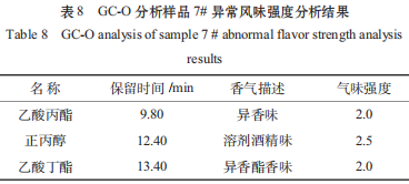 經(jīng)科學(xué)研究7#試品與15種出現(xiàn)異常成份對比,從味道特點和判定時間上明確乙酸丙酯、正丙醇、甲基叔丁基醚成分的存有。
