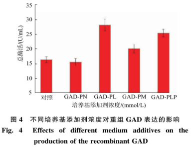 資產(chǎn)重組菌依照1.2.4開展搖瓶發(fā)醇,在操作過程中加上0.1mmol/LPL,研究其在不一樣發(fā)酵時(shí)間(0、12、24、36、48、60h)對資產(chǎn)重組菌生長發(fā)育(見圖7)和產(chǎn)GAD狀況(見圖8)的危害。與GAD-0對比,在發(fā)醇時(shí)問36h上下,PL對菌體的成長有一定的推動作州,是由于存蛋白表述全過程中,根據(jù)PLP挽救方式,PdxK蛋白激酶將PL磷酸化產(chǎn)生PLP,推動GAD的伸縮,一定水平上有益于菌體生長發(fā)育。伴隨著發(fā)醇時(shí)間的增加,南于PLP可靠性差而喪失功效,造成 菌體的生長發(fā)育有一定的降低。由圖8得知,與GAD-0對比,GAD-PL酶活最大做到28.28U/mL,加上適當(dāng)?shù)腜L能夠保證給GAD不明濃度值的PLP,進(jìn)而提升 GAD酶活。