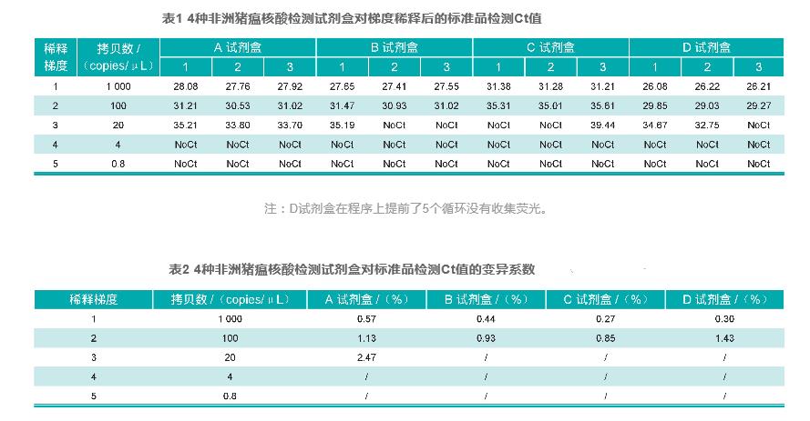 將B646L遺傳基因標準物質(zhì)稀釋液至1000copies/μL、100copies/μL、20copies/μL、4copies/μL、0.8copies/μL,共5個稀釋液度,應(yīng)用4種檢測試劑盒,依照其使用說明配備PCR管理體系,開展瑩光PCR檢驗,每一個稀釋液度反復(fù)3次,與此同時設(shè)定陰陽性對照。剖析各檢測試劑盒對不一樣梯度方向抗體檢測Ct值,較為不一樣檢測試劑盒對各稀釋液度的診斷率和變異系數(shù)。