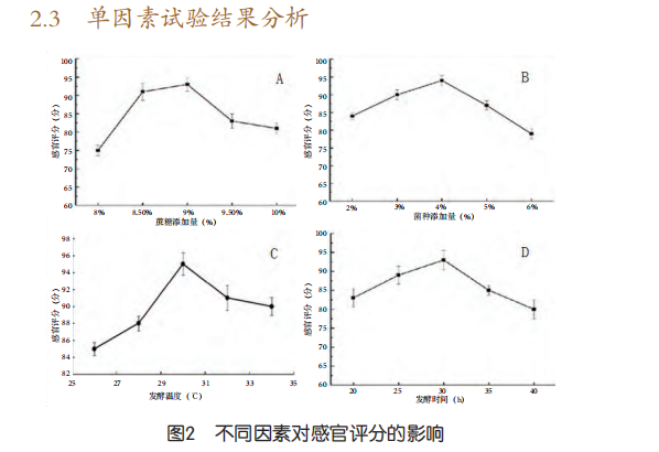 在進(jìn)行發(fā)酵全過(guò)程中,糖加上量、菌苗加上量、發(fā)酵溫度和發(fā)酵時(shí)間均對(duì)發(fā)酵乳感觀得分危害很大。用牦牛奶與荷斯坦牛奶占比為2:1開展單要素實(shí)驗(yàn),結(jié)果如圖2所顯示: