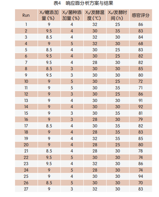依據(jù)單要素實(shí)驗(yàn)的結(jié)果,創(chuàng)建Box-BehnkenDesign核心組成設(shè)計(jì)方案實(shí)驗(yàn)實(shí)體模型,根據(jù)線性擬合二次方程測(cè)算最好加工工藝組成,選擇糖加上量、菌苗加上量、發(fā)酵溫度、發(fā)酵時(shí)間開展4要素3水準(zhǔn)響應(yīng)面分析,結(jié)果見(jiàn)表4。