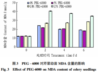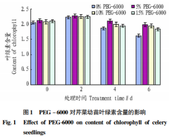 將萵筍小苗種植在規(guī)格型號為27cm×20cm的盆栽花盆中,每盆10棵,每過3d澆1次水,緩苗14d后選擇尺寸基本一致的小苗開展解決,往盆栽花盆的培養(yǎng)土中灌溉5%、10%、15%的PEG-6000水溶液,對照實驗為同樣容積的雙蒸水。每解決3個反復,在處置的第0、第2、第4、第六天抽樣測量。測量指標值有光合強度、可溶性糖成分、可溶蛋白質含量、mdA成分、乳酸脫氫酶(POd)活力和纈氨酸成分。