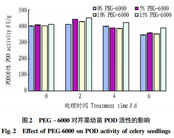 由圖2得知,PEG-6000解決時因為澆了一定量的水,第2天POd活力顯著上升,伴隨著時間的變化,生存條件里的水份逐漸缺少,POd活力顯著降低,并且歷經(jīng)PEG-6000解決的主莖因為PEG-6000鎖水,主莖內(nèi)POd活力比沒有處理的高。