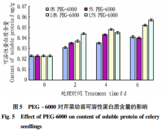 由圖5得知,歷經(jīng)加工處理以后主莖體內(nèi)的可溶蛋白質(zhì)含量呈持續(xù)上升發(fā)展趨勢(shì),且不一樣濃度值PEG-6000解決的綠植中間的可溶蛋白質(zhì)含量又各有不同。伴隨著解決時(shí)長的增加,可溶蛋白質(zhì)含量升高的發(fā)展趨勢(shì)減慢,這是由于伴隨著解決時(shí)長的增加,綠色植物生存條件的水分含量逐步降低,進(jìn)而造成體細(xì)胞內(nèi)的人體生理主題活動(dòng)緩減,體細(xì)胞內(nèi)的化學(xué)物質(zhì)生成減慢,可溶蛋白的成分提升減慢。