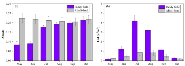 根據(jù)模擬計(jì)算的分析結(jié)果顯示,鹽堿土種稻有利于減少局部地區(qū)溫度和提升空氣濕度。這類減溫、加濕效用的頻率在生長季的不一樣月份主要表現(xiàn)出明顯差異(圖3),并關(guān)鍵表現(xiàn)在七、八月份,在其中,鹽堿土種稻會(huì)造成七月份溫度減少0.66℃,空氣濕度提升2.35%,八月份溫度減少0.67℃,空氣濕度提升2.11%??茖W(xué)研究員工根據(jù)分析其微生物地質(zhì)工程體制發(fā)覺,以蒸散減溫為核心的非輻射源全過程在調(diào)整氣候全過程中占主導(dǎo)性,而蒸釋放減溫與反照率提溫的衡量決策了生長發(fā)育季內(nèi)溫度和空氣濕度的回應(yīng)差別。