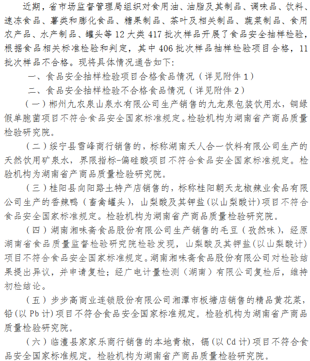 湖南省市場監(jiān)督管理局關于417批次食品安全抽樣檢驗情況的通告(2021年第15期)