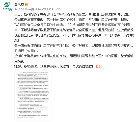 9月13日,新聞媒體了柳江區(qū)經(jīng)貿(mào)街某益禾堂加盟店存有“銀行柜臺(tái)好幾處有臭蟲(chóng)”、“店面小餐飲登記證書(shū)已貸款逾期”、“有職工未辦健康證就入崗”等狀況。對(duì)于此事,企業(yè)高管十分重視,第一時(shí)間創(chuàng)立了專項(xiàng)整治調(diào)研組,對(duì)涉嫌店面進(jìn)行嚴(yán)肅查處,整頓。