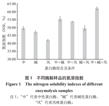 固定不動底物濃度值為15%,酶解溫度為50℃,酶解時間為4h,各酶濃度值均為1%,各自對中性蛋白酶、堿性蛋白酶及其口味胰蛋白酶的單酶及復(fù)合酶解標(biāo)準(zhǔn)完成了剖析,結(jié)果見圖1。