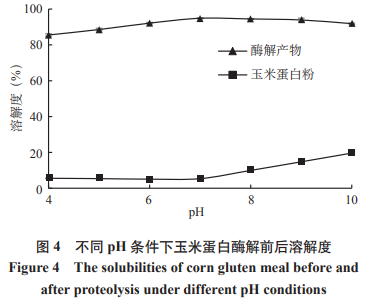 不一樣pH標準下玉米蛋白粉和酶解物質的溶解性見圖4。