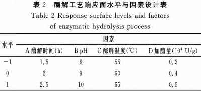 根據(jù)蛋白酶解加工工藝的單要素實(shí)驗(yàn)結(jié)果,以溫度、pH、加酶量、酶解時(shí)間4個(gè)要素為變量,以曠胃蛋白酶活力抑制率為響應(yīng)值,選用響應(yīng)面法四要素三水準(zhǔn)實(shí)驗(yàn)開展提升,依照BoX-Behnken基本原理開展試驗(yàn)設(shè)計(jì)。