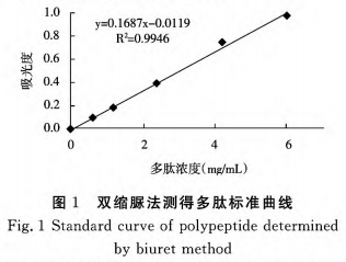 由圖1可獲得線性方程為,y=0.1687x—0.0119,相關(guān)系數(shù)r為R2=0.9946。式中:y為OD值A(chǔ);x為牛血清蛋白濃度值,mg/mL。