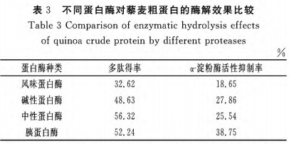 由表3得知,4種酶酶解后的活性多肽提取率都超出了30%,對(duì)α-胃蛋白酶活力具備一定的抑制效果,表明4種酶對(duì)黎麥蛋白質(zhì)都有著非常明顯的酶解實(shí)際效果,在其中中性蛋白酶和蛋白酶的活性多肽得率超出50%,而堿性蛋白酶和蛋白酶酶解后的抑制率較口味胰蛋白酶和中性蛋白酶高,蛋白酶解水平越大,活性多肽提取率也越高,轉(zhuǎn)化成的低分子結(jié)構(gòu)肽段就越大,具備抑止活力的肽段非常容易被溶解造成 抑止活力減少。充分考慮二種要素,挑選蛋白酶開展下一步的酶解實(shí)驗(yàn)。