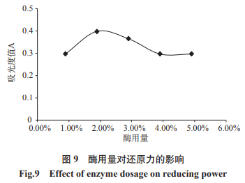 由圖8得知,伴隨著酶使用量的提升水解度擴大,在其中在酶使用量為2.9%時水解度較大,圖9得知,伴隨著酶使用量的擴大,復(fù)原力擴大,在其中在酶使用量為1.9%,復(fù)原力較大,之后逐漸降低,在酶使用量2.9%時有下降趨勢,可是不顯著。綜合性考慮到水解度、復(fù)原力和節(jié)約成本要素,覺得1.9%為最好酶使用量。