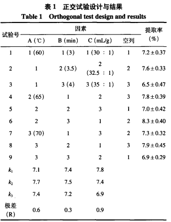 根據(jù)單要素實(shí)驗(yàn)結(jié)果,正交實(shí)驗(yàn)設(shè)計(jì)方案及結(jié)果見(jiàn)表1。