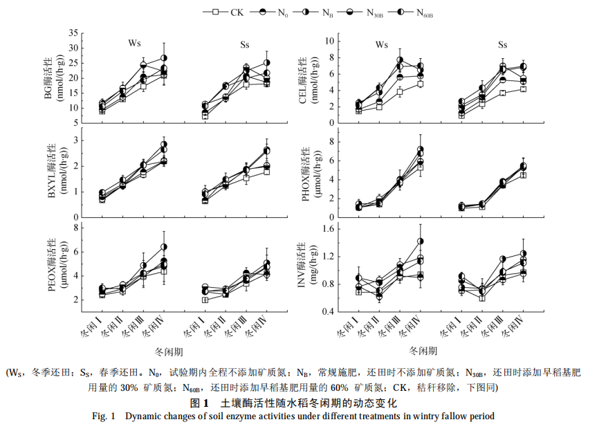 從圖 2 得知,秸稈綜合利用及秸稈綜合利用并配施基肥的解決明顯地提升冬閑期 CEL 的活力,但秸稈綜合利用時(shí)配施肥的百分比對(duì) CEL 的活力危害并不明顯。冬天還田(Ws)標(biāo)準(zhǔn)下的 N0、NB、N30B 和 N60B 秸稈綜合利用解決 CEL 活力平均值為:3.94 ~ 5.15 nmol/(h·g),NB、N30B和 N60B 3 個(gè)配施基肥的解決 CEL 活力平均值為:5.12 ~ 5.15 nmol/(h·g),3 個(gè)解決間無(wú)明顯差別(P>0.05);3個(gè)配施基肥的解決 CEL 活力平均值均明顯高過(guò)秸稈綜合利用但施于基肥的 N0 解決(3.94 nmol/(h·g))和秸桿不還田的 CK 解決(3.01 nmol/(h·g))。春天還田(Ss)標(biāo)準(zhǔn)下4 個(gè)秸稈綜合利用解決 CEL 活力冬閑期平均值為:3.62 ~ 5.14 nmol/(h·g);3 個(gè)配施基肥的處置中,CEL 活力在 NB(4.62 nmol/(h·g))和 N30B(4.55 nmol/(h·g))解決間無(wú)明顯的差別,且均小于 N60B(5.14 nmol/(h·g))解決;3 個(gè)配施基肥的解決春天還田(Ss)標(biāo)準(zhǔn)下的CEL 活力均明顯高過(guò)秸稈綜合利用但施于基肥的 N0 處 理 (3.62 nmol/(h·g)) 和秸桿不還田的 CK 處 理 (2.78 nmol/(h·g))。而秸稈綜合利用及秸稈綜合利用并配施基肥的解決整體上并沒(méi)有明顯地更改冬閑期限內(nèi)別的5 種酶(BG、BXYL、PHOX、PEOX 和 INV)的活力(圖 2)。