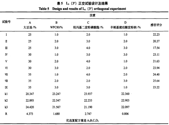 WPC80和辛烯基琥珀酸木薯淀粉鈉均具備乳狀液性,因而在單要素實(shí)驗(yàn)中并沒有添加辛烯基琥珀酸木薯淀粉鈉,以防干擾檢驗(yàn)結(jié)果。植物油脂為卡士達(dá)餡給予更快的口融性,羥丙基二木薯淀粉磷酸酯已被普遍地以為是最合適卡士達(dá)餡的變性淀粉,ShaikhM的試驗(yàn)表明羥丙基二木薯淀粉磷酸酯在卡士達(dá)餡中(相對(duì)性于辛烯基琥珀酸木薯淀粉鈉、空氣氧化木薯淀粉、乙?;臼淼矸郏┚邆涓鼜?qiáng)的口味、可靠性及耐老化性。