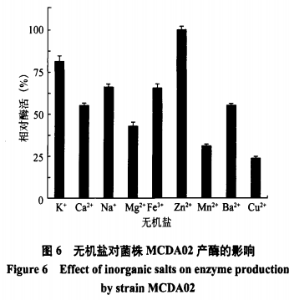 碳酸鹽對(duì)菌種MCDA02生長發(fā)育的危害如圖所示6,選定的9種不一樣的碳酸鹽中,加上ZnSO4時(shí)該菌種產(chǎn)酶最大,隨后是KH2PO4,其相對(duì)性酶活達(dá)75%之上,加上CuSO4時(shí)相對(duì)性酶活最少,不夠25%。因而最后采用ZnSO4為配置發(fā)醇培養(yǎng)液常用碳酸鹽。