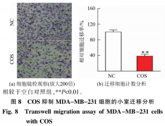充分考慮MDA-MB-231體細(xì)胞的高轉(zhuǎn)移特點,最先以小室轉(zhuǎn)移試驗身體之外調(diào)查COS能不能抑止腫瘤干細(xì)胞蔓延。如圖所示8所顯示,500μg/mLCOS功效后,相比于試劑空白組(NC),COS組的體細(xì)胞轉(zhuǎn)移總數(shù)顯著降低(**P<0.01)。表明COS可高效抑止MDA-MB-231體細(xì)胞轉(zhuǎn)移,這與Nam等報導(dǎo)的科學(xué)研究狀況一致。除此之外,COS抑止腫瘤干細(xì)胞轉(zhuǎn)移的情況也存有于成化學(xué)纖維HTl080體細(xì)胞和MCF-10A甲狀腺鱗狀上皮細(xì)胞。從而確定了COS抑止腫瘤干細(xì)胞轉(zhuǎn)移的功效。