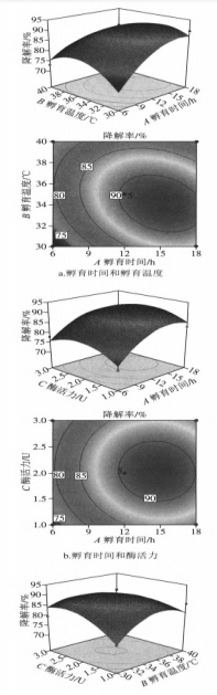 從圖6b能夠看得出,酶魅力相匹配的響應(yīng)值的曲線圖險(xiǎn)峻,表明對(duì)AFB1的溶解率危害很大,而孵育時(shí)間相對(duì)應(yīng)的響應(yīng)值曲線圖相對(duì)性輕緩,說明孵育時(shí)間對(duì)AFB1溶解率的危害并不大,酶魅力和孵育時(shí)間的等值線類似環(huán)形,說明酶魅力和孵育時(shí)間的配對(duì)t檢驗(yàn)對(duì)AFB1溶解率的危害較??;從圖6c能夠看得出,酶魅力相匹配的響應(yīng)值曲線圖相對(duì)性較陡,而孵育溫度相對(duì)應(yīng)的響應(yīng)值曲線圖較輕緩,說明酶魅力對(duì)AFB1溶解率危害很大,酶魅力和孵育溫度的等值線平扁,說明酶魅力和孵育溫度的配對(duì)t檢驗(yàn)對(duì)AFB1溶解率的干擾很大。