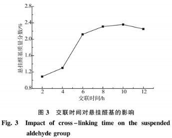 如圖所示3所顯示,在2~8h區(qū)域內(nèi),媒介上的懸架醛基隨化學(xué)交聯(lián)時間的提高而提升;當(dāng)化學(xué)交聯(lián)時問做到8h后,懸架醛基的質(zhì)量濃度基本上維持不會改變。表明8h的化學(xué)交聯(lián)時間足夠使戊二醛水溶液中的醛基與媒介上的羥基充足反映,使媒介對酶的固定量較大。因而,挑選8h做為殼聚糖脂質(zhì)體媒介和戊二醛水溶液的化學(xué)交聯(lián)時間。