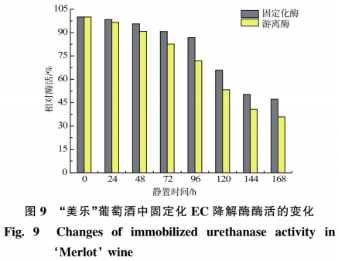 如圖所示9所顯示,伴隨著靜放時間提升,分散酶和固定化酶EC溶解酶酶活均出現(xiàn)下降趨勢,但存全部流程中,固定化酶活均高過分散酶酶活。當(dāng)靜放96h時,固定化酶活與分散酶酶活相距較大,相比于最初酶活差別,中后期的差別更高,可能是南于同樣酶量的標(biāo)準(zhǔn)下,最初分散酶更易于與底物觸碰,而隨之時間流逝,固定化因?yàn)槊浇榈谋U瞎π?,仍能漸漸地表明出較高的酶促反應(yīng)。靜放144h以前,固定化酶活的損率在50%下列,表明此酶能夠融入“美樂”紅酒的微自然環(huán)境,用以紅酒中EC的除去。