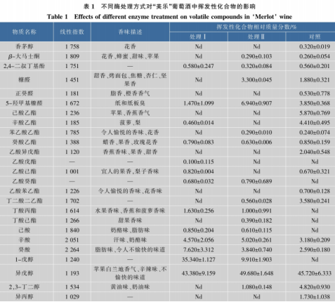 對照實(shí)驗(yàn)和解決組的紅酒中揮發(fā)物口味成分的相應(yīng)成分如表1所顯示,在3種處理方法下的紅酒巾,共監(jiān)測到29種香味成份,包含12種脂類、9種醛類、3種有機(jī)物和5種醛、酮、酚類化合物。經(jīng)剖析得知,不一樣解決組中各揮發(fā)物有機(jī)物的相應(yīng)成分中間無明顯差別,可是相對于對照實(shí)驗(yàn),解決組的有機(jī)物類型均有一定的降低,在其中固定化解決組降低了8種化學(xué)物質(zhì),而分散酶解決組降低了12種化學(xué)物質(zhì)。表明酶解決對紅酒巾揮發(fā)物有機(jī)物的品種總數(shù)有一些危害,但對化學(xué)物質(zhì)的相應(yīng)成分危害不明顯,并且,固定化處理方法對紅酒更為友善。對比對照實(shí)驗(yàn).酶解決組里的成分均發(fā)生了總數(shù)的降低,但消退的化學(xué)物質(zhì)并不相同,固定化解決組降低的成分包含:香茅醇、正癸醛、己酸乙酯、心酸乙酯、甲酸異戊酯、甲酸己酯、甲酸苯乙酯和等保。而分散酶解決組降低的化學(xué)物質(zhì)分別是香茅醇、盧一大馬士酮、糠醛、正癸醛、己酸乙酯、苯乙酸丁酯、甲酸異戊酯、甲酸苯乙酯、丁二酸二乙酯、2,3一丁二醇、等保、1一己醇。表明不一樣種類的酶解決對紅酒的危害不一樣,但充分考慮分散酶造成芬芳味和果香氣化學(xué)物質(zhì)的損害更高,F(xiàn)向于在考慮到口味多元性時要防止不愉快口味的發(fā)展趨勢,因而提議對“美樂”紅酒應(yīng)用固定化酶EC溶解酶開展解決。
