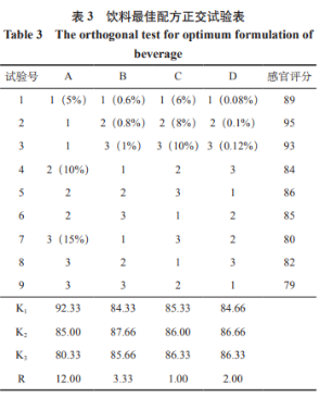 由表3得知,危害銀鱈魚骨水解蛋白霍山石斛飲品的要素次序?yàn)锳>B>D>C,即銀鱈魚骨酶解液的增加量對飲品的感觀質(zhì)量危害較大 ,次之是石斛粉加上量、檸檬酸鈉加上量和白糖加上量。經(jīng)偏差剖析獲得的最佳配制為A1B2C3D2,即:銀鱈魚骨酶解液5%、霍山石斛超微粉碎0.8%、白糖10%、檸檬酸鈉0.1%。而在正交試驗(yàn)全過程中并沒有發(fā)生該項配制,開展認(rèn)證實(shí)驗(yàn),其感觀得分為97分,為飲品的最佳配制。按此秘方制取的銀鱈魚骨酶解液霍山石斛飲品呈鮮淡黃色,材質(zhì)勻稱,酸甜可口。