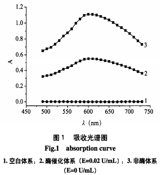 不一樣管理體系光譜圖見圖1。木薯淀粉與碘化鉀溶液在可見光波長區(qū)無消化吸收峰(圖1曲線圖1);木薯淀粉、碘酸鉀與雙氧水水溶液中,雙氧水空氣氧化碘酸鉀,淀粉溶液呈深藍(lán)色,600nm上有較大消化吸收(圖1曲線圖3),峰形銳利,最高值較高,H2O2表觀克分子吸光度指數(shù)ε600=2.79×104L/(mol·cm);添加CAT后,著色受抑止(圖1曲線圖2),但峰位未發(fā)生改變,這表明反映僅出現(xiàn)于雙氧水與碘酸鉀中間,著色水平與雙氧水成分相關(guān)。試驗(yàn)選擇600nm作測量光波長。