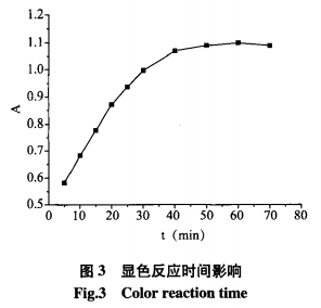 取50ml容量瓶一只,添加CAT樣液(酶促反應(yīng)低于2U/mL)1.00mE、H202栽培基質(zhì)液2.00mL,25℃水浴反映30min后馬上添加1.5mL鹽酸停止反映,加碘酸鉀5mL,60℃水浴加熱40min,制冷,加木薯淀粉3mL,滴定劑,以純凈水作參比液,在光波長600nm處測OD值A(chǔ),與此同時進行酶試劑空白OD值A(chǔ)0測量,依據(jù)△A(△A=A0一A)明確過氧化氫酶活力E。其他情況不會改變,只更改反應(yīng)速度,測量5~70min內(nèi)A值(圖3)。30min內(nèi)OD值與時間有線性相關(guān)。不難看出,H2O2空氣氧化KI具備零級反應(yīng)的特性,生成物初始濃度值立即影響了反應(yīng)速率,40min后反映徹底。因此 顯色反應(yīng)時間確認為40min。