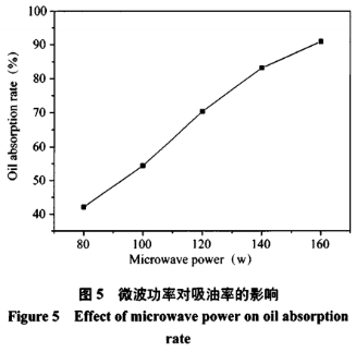 微波加熱輸出功率挑選80W、100w、120W、140W、160w,別的主要參數(shù)挑選為:微波加熱時間40min、管理體系pH5.2、加酶量為9U/g、反映溫度55℃、超音波輸出功率400W。吸油率如圖所示5所顯示。