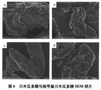 用透射電鏡觀查川番木瓜含糖量與羧甲基川番木瓜含糖量的表面外貌,試驗(yàn)結(jié)果如圖所示6所顯示。a、b是川番木瓜含糖量變大5×103倍和104倍的外貌,c、d是羧甲基川番木瓜含糖量變大5×103倍和104倍的外貌。在同樣的擴(kuò)大倍率下對(duì)比a、c及b、d,反映前后左右展現(xiàn)出不一樣的外貌。川番木瓜含糖量的外邊光潔,表層基本上無孔眼,而羧甲基川番木瓜含糖量表面松散多孔結(jié)構(gòu),呈碎渣狀沉積,有顯著的管溝構(gòu)造。以上結(jié)果表層羧甲基反映更改了原含糖量的外貌及構(gòu)造。