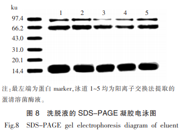 將最佳陽離子交換所得的的過柱液與最佳的超滲瀝液各自抽樣開展SDS-PAGE凝膠電泳實驗,電泳原理結(jié)果如圖所示8和圖9所顯示。