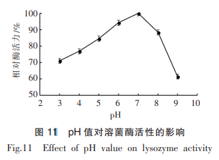 由圖11得知,隨pH值的持續(xù)上升,溶菌酶的相對性酶活呈先升高后降低的發(fā)展趨勢,溶菌酶在pH5~8均可維持85%之上的相對性酶活,在pH數(shù)值3~4時仍有70%之上的相對性酶活,在pH數(shù)值7.0時,酶魅力做到最高值,可推斷,溶菌酶的適宜pH值約為7.0。pH值危害溶菌酶酶活的因素可能是因為pH值的更改對底物溶壁微革蘭陰性桿菌的情況造成危害,也可能是pH值促使酶的通電情況更改,進而危害酶的活性。