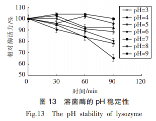 由圖13得知,溶菌酶在呈酸性及中性化的條件下相對穩(wěn)定,在pH4.0~7.0的范疇內(nèi),相對性酶活維持在88%之上。而在偏堿自然環(huán)境下,伴隨著時間增加,相對性酶活慢慢降低,且隨pH值上升,變化幅度越來越大,在pH8.0的鹽水中解決90min,酶魅力降為原始的80%,而在pH9.0的鹽水中解決90min,酶魅力降為原始的65%。故溶菌酶在偏酸堿性及中性化情況下比較平穩(wěn),經(jīng)過酸、過堿易使其降解,這與傅婷等的分析結(jié)果相近,可能是因為溶菌酶在酸堿性自然環(huán)境中為碳鏈構(gòu)像隨酸值轉(zhuǎn)變危害并不大,構(gòu)造相對穩(wěn)定。