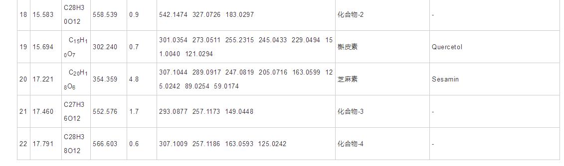由以上結果得知油荼葉提取液中的花青素與黃酮類可能是抑止5α-R的主要物質條件,選用UPLC-TripleTOF-MS/MS對COLE中的酚類開展定性研究,結果在COLE中中國共產(chǎn)黨發(fā)覺22種酚類。圖8為空氣負離子方式下的總正離子圖,表4為COLE中酚類評定結果。RichardA.等分析證實蘆丁(IC50>100μmol/L)、原兒茶醛(IC50=23μmol/L)具備I型5α-R抑止活力。此外還發(fā)覺兒茶酸等茶氨酸類化合物,在無體細胞情況下展現(xiàn)出合理的5α-R抑制效果,但在5α-R的全體細胞剖析中抑制效果不顯著。周琛媛等在具備高5α-R抑止活力的油茶樹蒲丙烯酸樹脂組Fr8中分離純化(選用固相萃取的方法),根據(jù)質譜分析和磁共振檢查的方式開展構造評定出F1為3-O-沒食子?;?4,6,–α/β-D-吡喃葡萄糖水(GeminD),F(xiàn)4為3,4,6-3-O-沒食子?;?α/β-D-吡喃葡萄糖水(GAG)。這種化學物質均在COLE中被發(fā)覺,他們是COLE充分發(fā)揮5α-R抑止活力的物質條件。