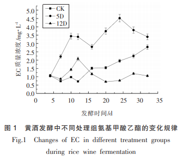 早期研究發(fā)現(xiàn),OTC與EC的產(chǎn)生呈負(fù)關(guān)聯(lián)性,即OTC的表述對(duì)EC的產(chǎn)生有抑制效果,而OTC與EC的立即關(guān)聯(lián)性并沒(méi)有見(jiàn)一切報(bào)導(dǎo)。因而,本實(shí)驗(yàn)各自在米酒發(fā)醇的早期(發(fā)醇第5天)和中后期(發(fā)醇第12天),加上同樣濃度值提純后的OTC酶,以證實(shí)其與EC產(chǎn)生的立即關(guān)聯(lián)性。如圖所示1所顯示,在發(fā)醇逐漸直到第12天,實(shí)驗(yàn)組EC成分均明顯超過(guò)對(duì)照實(shí)驗(yàn),而在12d以后,實(shí)驗(yàn)組12D的EC成分主要表現(xiàn)出突出的下降趨勢(shì),直到發(fā)醇完畢。而在發(fā)醇早期加上OTC酶的實(shí)驗(yàn)組5D則明顯增強(qiáng)了EC成分,發(fā)生這一趨勢(shì)分析的因素也有待進(jìn)一步科學(xué)研究??偠灾?,在適當(dāng)?shù)陌l(fā)醇環(huán)節(jié),如發(fā)醇的中后期,OTC酶的加入對(duì)EC產(chǎn)生確實(shí)有抑制效果,殊不知若加上時(shí)間不適合,則有可能推動(dòng)EC的產(chǎn)生新陳代謝。