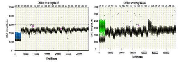 ddPCR對獲取和制取的橙黃色鏈球菌和蠟樣枯草芽孢菌及15株別的病菌DNA作模版,點評創(chuàng)建ddPCR方式非特異。數(shù)據(jù)顯示,橙黃色鏈球菌和蠟樣枯草芽孢菌均展現(xiàn)呈陽性增加數(shù)據(jù)信號,每孔微滴產(chǎn)生量平衡(圖1,深藍(lán)色是金葡菌,翠綠色是蠟樣);而15株別的病菌試驗孔均未驗出到呈陽性微滴數(shù)據(jù)信號,均不會有交叉式反映,說明創(chuàng)建的橙黃色鏈球菌和蠟樣枯草芽孢菌ddPCR方式非特異較強(qiáng)。