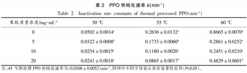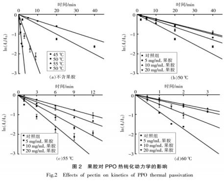 熱鈍化處理溫度范圍為45~60℃時(shí),阿拉伯膠對(duì)PPO熱鈍化處理動(dòng)力學(xué)模型的干擾如圖2所顯示,其熱鈍化處理速度如表2所顯示。由圖2a得知,在沒(méi)有含阿拉伯膠的情形下,經(jīng)45℃熱處理工藝后PPO產(chǎn)生輕度鈍化處理,熱處理工藝20min后PPO活力仍維持在50%之上,其鈍化處理速度為0.0308min-1。伴隨著解決溫度的上升,PPO熱鈍化處理速度慢慢加速,經(jīng)55℃熱處理工藝3min后PP0相對(duì)性活力僅為33.5%:當(dāng)環(huán)境溫度上升至60℃時(shí),熱處理工藝1min可讓PP0活力減少50%之上,2min后PPO基本上降解,鈍化處理速度為0.8665min-1。阿拉伯膠的添加使PPO對(duì)熱鈍化處理的敏感度減少。在相對(duì)性柔和的熱處理工藝前提下(50℃),PPO熱鈍化處理速度為0.0502min-1,而5mg/mL阿拉伯膠使PP0熱鈍化處理速度減少至0.0322min-1(圖2b)。伴隨著阿拉伯膠濃度值的提升,PP0熱鈍化處理速度漸漸降低,當(dāng)阿拉伯膠濃度值上升至10mg/mL時(shí),PPO熱鈍化處理速度降低至0.0254min-1。熱處理工藝溫度上升至55℃時(shí),PP0的熱鈍化處理速度具備同樣的發(fā)展趨勢(shì)(圖2c),5,10,20mg,mL阿拉伯膠使PPO熱鈍化處理速度由0.2636min。一分別降低至0.1733,0.1180,0.0865min-1。從圖2d能夠看得出,伴隨著熱處理工藝溫度持續(xù)上升,60℃熱處理工藝2min使PPO活力降低至19.7%,而5mg/mL和10mg/mL阿拉伯膠能使PP0活力各自維持為56.2%和58.0%,其熱鈍化處理速度各自減少了0.5804min。1和0.6214min-1。研究組早期科學(xué)研究報(bào)導(dǎo)菌類PP0對(duì)熱十分比較敏感,高溫短時(shí)間或超低溫長(zhǎng)時(shí)熱處理工藝均能合理鈍化處理其活力。本實(shí)驗(yàn)結(jié)果顯示阿拉伯膠能提高PP0在50~60℃范疇內(nèi)的耐熱性,且這類提高功效展現(xiàn)一定的濃度值依賴感。有科學(xué)研究報(bào)導(dǎo)稱蛋白與阿拉伯膠間的相互影響會(huì)更改蛋白的耐熱性.這很有可能與阿拉伯膠在蛋白質(zhì)表層產(chǎn)生嚴(yán)密的網(wǎng)絡(luò)架構(gòu)息息相關(guān)圜。熱處理工藝根據(jù)誘發(fā)PP0分子產(chǎn)生集聚或去伸縮轉(zhuǎn)變使其活力減少,網(wǎng)狀結(jié)構(gòu)阿拉伯膠對(duì)PP0分子的盤繞或包埋功效很可能維護(hù)PP0構(gòu)造免遭熱鈍化處理的危害,與此同時(shí)阿拉伯膠分子結(jié)構(gòu)中羧基官能團(tuán)的氧分子可與PP0分子中的氫原子產(chǎn)生共價(jià)鍵進(jìn)而提高PPO可靠性,減少其熱鈍化處理速度。因而,蔬菜水果產(chǎn)品如蔬果汁、蔬菜水果泥及蘋果醬等食品類管理體系中阿拉伯膠的出現(xiàn)將會(huì)使PPO主要表現(xiàn)出更強(qiáng)的耐熱性,也是PP0在不一樣管理體系中熱鈍化處理動(dòng)力學(xué)模型差別的因素之一。