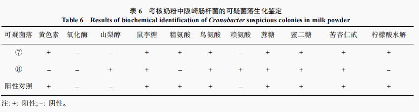 對(duì)試品V在TSA平板電腦上成長(zhǎng)的2種菌體⑦和⑧開展生物化學(xué)評(píng)定,如表6,結(jié)果顯示,異常菌體⑦產(chǎn)黃色素,抗霉素、山梨糖醇、磷酸氫鈣呈陰性,精氨酸雙核糖核苷酸、鼠李糖、綿白糖、蜜二糖、苦杏仁甙呈陽性,評(píng)定結(jié)果合乎阪崎腸桿菌生物化學(xué)特點(diǎn)。菌體⑧的生物化學(xué)評(píng)定結(jié)果不符阪崎腸桿菌生物化學(xué)特點(diǎn)。不難看出,α-葡萄糖苷酶呈陽性是阪崎腸桿菌的特性,可是并不是唯一;阪崎腸桿菌著色培養(yǎng)液對(duì)阪崎腸桿菌的非特異是有局限的,這與吳清平等的闡述一致。當(dāng)在著色平板電腦上發(fā)覺有異常菌體,若評(píng)定為弱陽時(shí),要用全排列組合問題,不然很容易發(fā)生假陰性。