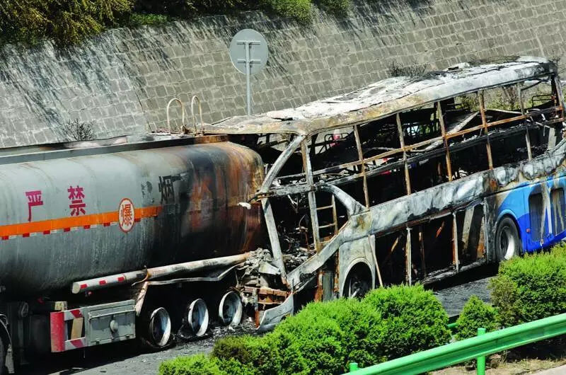 2012年8月26日2時31分許,包茂高速公路陜西省延安市境內(nèi)發(fā)生一起特別重大道路交通事故,造成36人死亡、3人受傷,直接經(jīng)濟損失3160.6萬元。事故原因是:裝載35.22噸甲醇的重型半掛貨車從匝道違法駛?cè)敫咚俟?,在高速公路上違法低速行駛;臥鋪大客車遇重型半掛貨車從匝道駛?cè)敫咚俟窌r,本應(yīng)能夠采取安全措施避免事故發(fā)生,但因疲勞駕駛而未采取安全措施,正面追尾碰撞重型半掛貨車。碰撞致使臥鋪大客車前部與重型半掛貨車罐體尾部鉸合,大客車右側(cè)縱梁撞擊罐體后部卸料管,造成卸料管豎向球閥外殼破碎,導致大量甲醇泄漏。碰撞也造成臥鋪大客車電氣線路絕緣破損發(fā)生短路,產(chǎn)生的火花使甲醇蒸氣和空氣形成的爆炸性混合氣體發(fā)生爆燃起火,大火迅速引燃重型半掛貨車后部和臥鋪大客車,并沿甲醇泄漏方向蔓延至附近高速公路路面和涵洞。