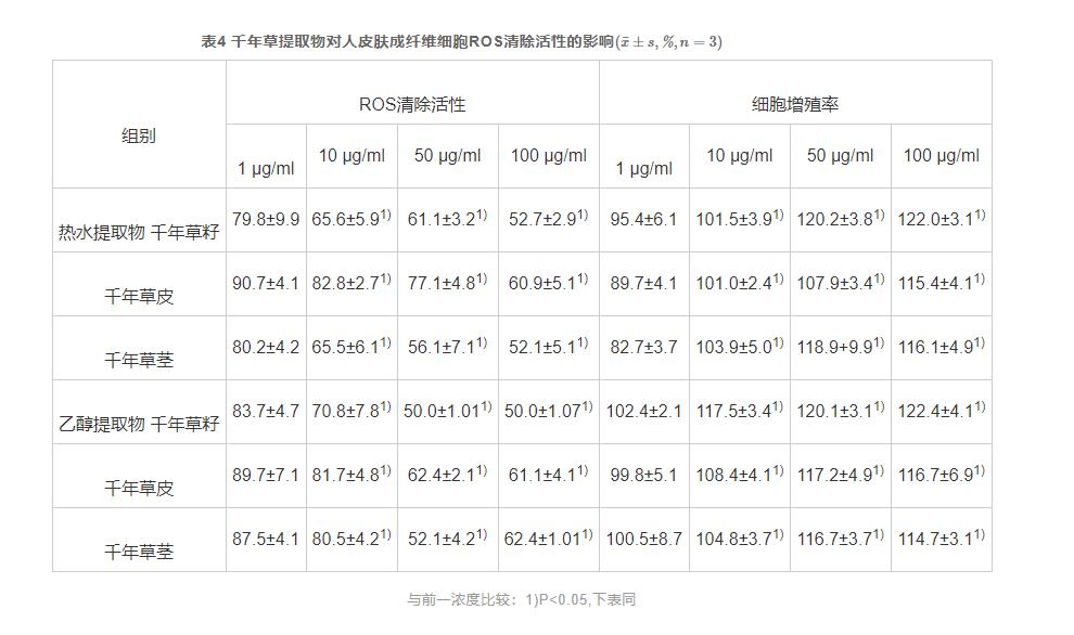 伴隨著上千年草提取液濃度值的上升人肌膚纖維細(xì)胞ROS活力慢慢被抑止,在其中,50μg/ml,100μg/ml濃度值的上千年草種酒精提取液的ROS消除活力最強(qiáng),見表4。