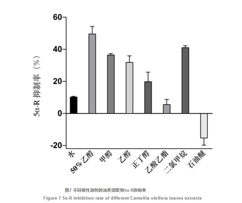 依據(jù)圖7得知,200 μg/mL的油荼葉提取液對(duì)5α-R的抑止活力有影響,油荼葉乙醚提取液對(duì)其有推動(dòng)作用,而別的油荼葉提取液展現(xiàn)不一樣水平的抑制效果,在其中油荼葉50%酒精提取液對(duì)5α-R抑止實(shí)際效果最顯著達(dá)到49.77%±4.43%,次之,二氯甲烷提取液和工業(yè)甲醇提取液5α-R的抑止活力也較高,各自為41.26%±0.02%、36.66%±0.71%。因?yàn)橛洼比~50%酒精提取液5α-R抑制率最大,因而最好制取有機(jī)溶劑為50%酒精,并將其提取液取名為COLE(Camellia Oleifera Leaves Extract, COLE),測(cè)出其IC50為259.56 μg/mL。已經(jīng)知道臨床醫(yī)學(xué)上應(yīng)用度他雄胺的醫(yī)治藥量為0.5 mg/d,歷經(jīng)等效電路計(jì)算,若使5α-R抑止活力為指標(biāo)值,39.35 mg/d COLE與度他雄胺臨床醫(yī)學(xué)使用量治療效果非常。